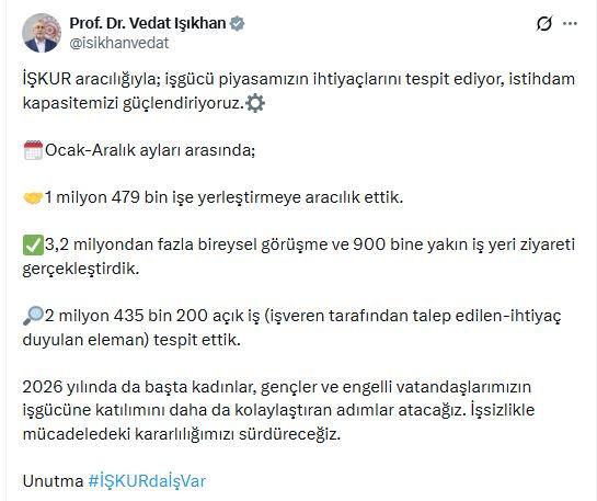 Bakan Işıkhan, 2026 yılında istihdam politikalarının daha da genişletileceğini belirterek; kadınlar, gençler ve engelli vatandaşların iş gücüne katılımını kolaylaştıracak yeni adımların atılacağını vurguladı.